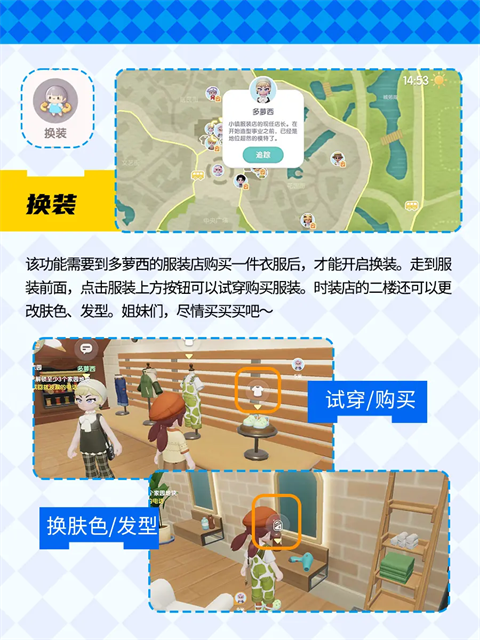 6、【换装】该功能需要到多萝西的服装店购买一件衣服后,才能开启换装。走到服装前面,点击服装上方按钮可以试穿购买服装。时装店的二楼还可以更改肤色、发型。姐妹们,尽情买买买吧~