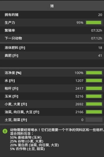 猪是新增加的牲畜,基本上它们什么都吃,所以要求有足够多的农作物储备来养猪。养猪的收益在于它们会生小猪仔,可以将这些新猪仔运至牲畜销售点出售。