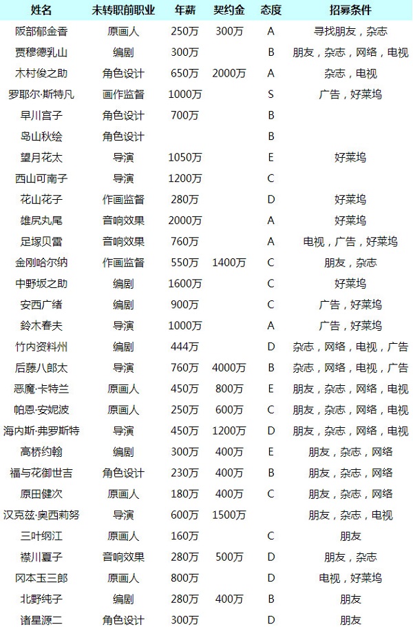动画工作室物语职员基础属性介绍1.动画工作室物语职员基础属性介绍2.画力,这是动画制作的基本数值,越高越容易做出出色的作品,视听率也会上涨。3.而剧本数值越高,就会发现越多的资料点,在当监督的时候可能会写出出色的故事。4.感觉和音响越高作品里的音乐数值就会越高。5.体力的话在开发和教育中会减少,没有了体力之后就要暂时回家了。6.职员的职业有原画和脚本担当等职业,不同的职业监督出的动画数值倾向也会变化,教育时会发现新的内容哦。7.职员的转职就是利用设施的职业研究所可以转职为其他的职业,一些职业升级到5级之后还会出现新的就职的上级职业哦。8.勤务态度,如果职员的态度不好的话,在没有体力回家之后会很长时间不回来,配置了温泉和客房后,态度好就可能会有人气。动画工作室物语初始角色如何选择1、手枪大助属性:勇敢12、搞笑1、亲近4、可爱1、怪人1。市场价值是30万。2、拳法少女属性:勇敢12、搞笑4、亲近4、可爱1、怪人3。市场价值是30万。3、卖火柴的多惠子属性:勇敢2、搞笑6、亲近5、可爱2、怪人3。市场价值是30万。4、加藤建次君属性:勇敢2、搞笑9、亲近10、可爱12、怪人1。市场价值是30万。5、吹笛男属性:勇敢3、搞笑4、亲近12、可爱8、怪人2。市场价值是30万。这五个角色里加藤健次郎的属性最好,适合长时间发展,在开发新角色之前一直用它就好了设施可以在社内配置和动画制作有关选择内容,不光能够提高社员的能力,还有这各种其他的效果。人气动画舞台和内容的组合非常的重要,提高主人公的魅力,实行宣传和申请,增加支持者也是很重要的。动画大奖每年都会举办动画大奖,有很多的奖项可以拿到。获得头等大奖的话公司是可以加入大企业中的。大结局和继承游戏在经过20年之后会迎来大结局,至今为止总财产可以登录到榜单,那之后就可以继续游戏了。社员/职员/员工/人物