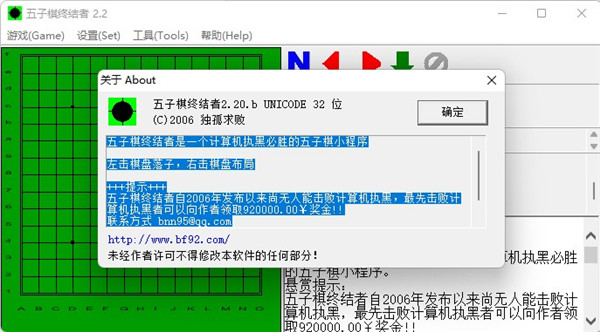 五子棋终结者是一款计算机执黑必胜的五子棋小程序,这款小程序搜索完了五子棋的全部空间,建立了完整执黑必胜谱。它自2006年发布以来,从来没有人击败过计算机执黑。本次小编为你带来的是这款软件的2.20.b版本,也是官方最新版。在这个版本中,玩家可以执黑子来和开放了思考引擎的计算机进行对战,用户可以通过这款软件学习五子棋执黑的下法,让你以五子棋轻松击败你的小伙伴。同时,新版本的引擎可配置,引擎的棋力与思考时间正相关,解决了非中文系统中的界面显示乱码、多开声音问题,开放了思考引擎的执白功能,增加了输入棋谱功能。当然这个最新款还是终结者,只要计算机执黑还是必胜。如果有兴趣可以尝试挑战一下!!