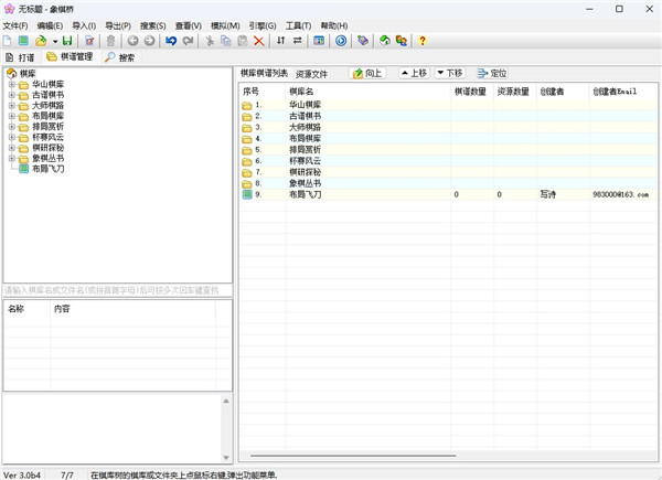 2、以棋库为基本文件单位,可将同类棋谱放到一个棋库里,可将同类棋库放到一个文件夹中。