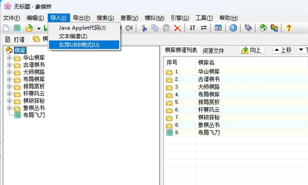 4、回到象棋桥界面,选择导入,在下拉菜单中选择“东萍UBB”