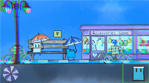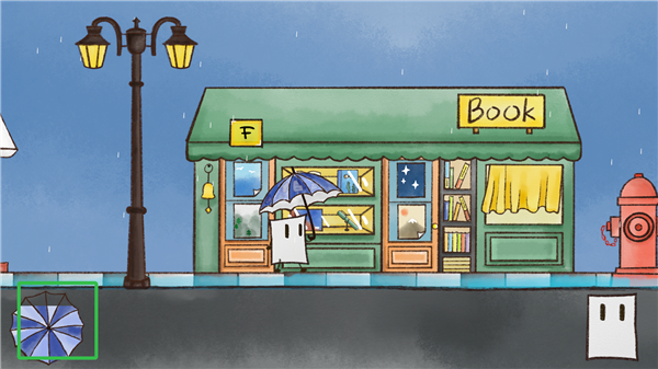 雨天电脑版游戏设计了许多店铺,如冰淇淋店、面包店、书店等,玩家可以进入躲避雨水,而且有些店铺内的暖气能将一张纸身上的雨水烘干。操控一张纸向右一直走回家吧!