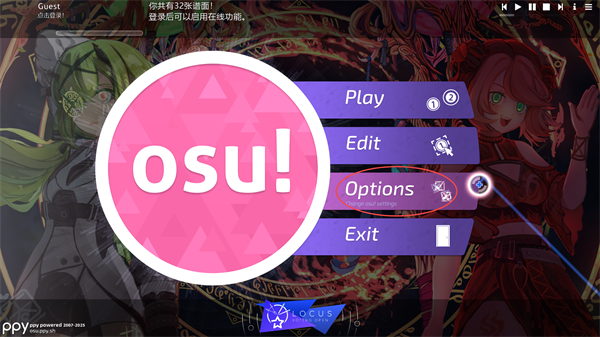 1、进入游戏,点击osu!图标,出现的四个按钮,分别为Play(玩),Edit(编辑),Options(设置/选项),和Exit(退出)。