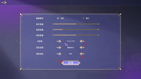2、在如图所示位置中右选找到简体中文,如果想要听日语或者是英语可以不更改语音语言,设置完成后就可以点击应用;