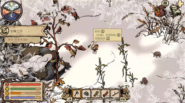 7、将工具装备起来,继续前往野外探索收集,当屏幕出现寒冰时,需要回洞穴取暖,等待数值没有会死亡!