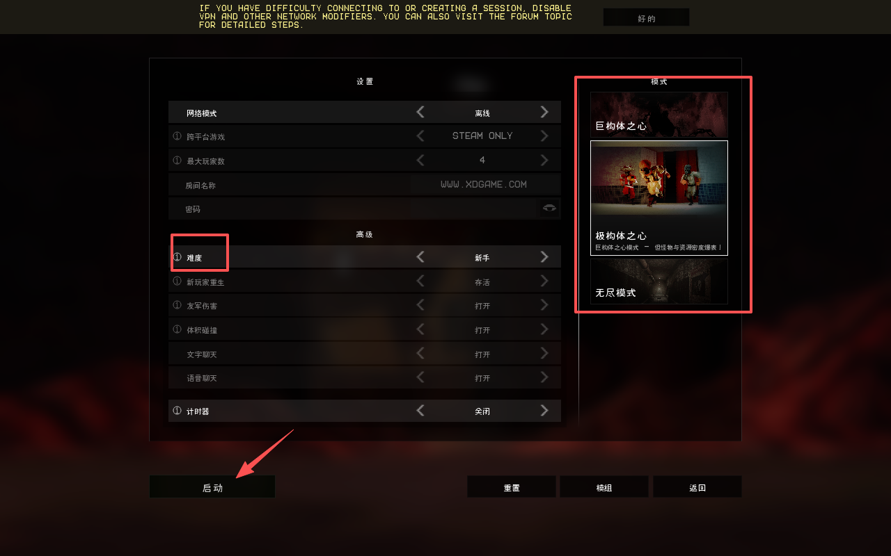 3、可以在这里选择游戏难度和游戏模式,随后点击屏幕左下角的“启动”。