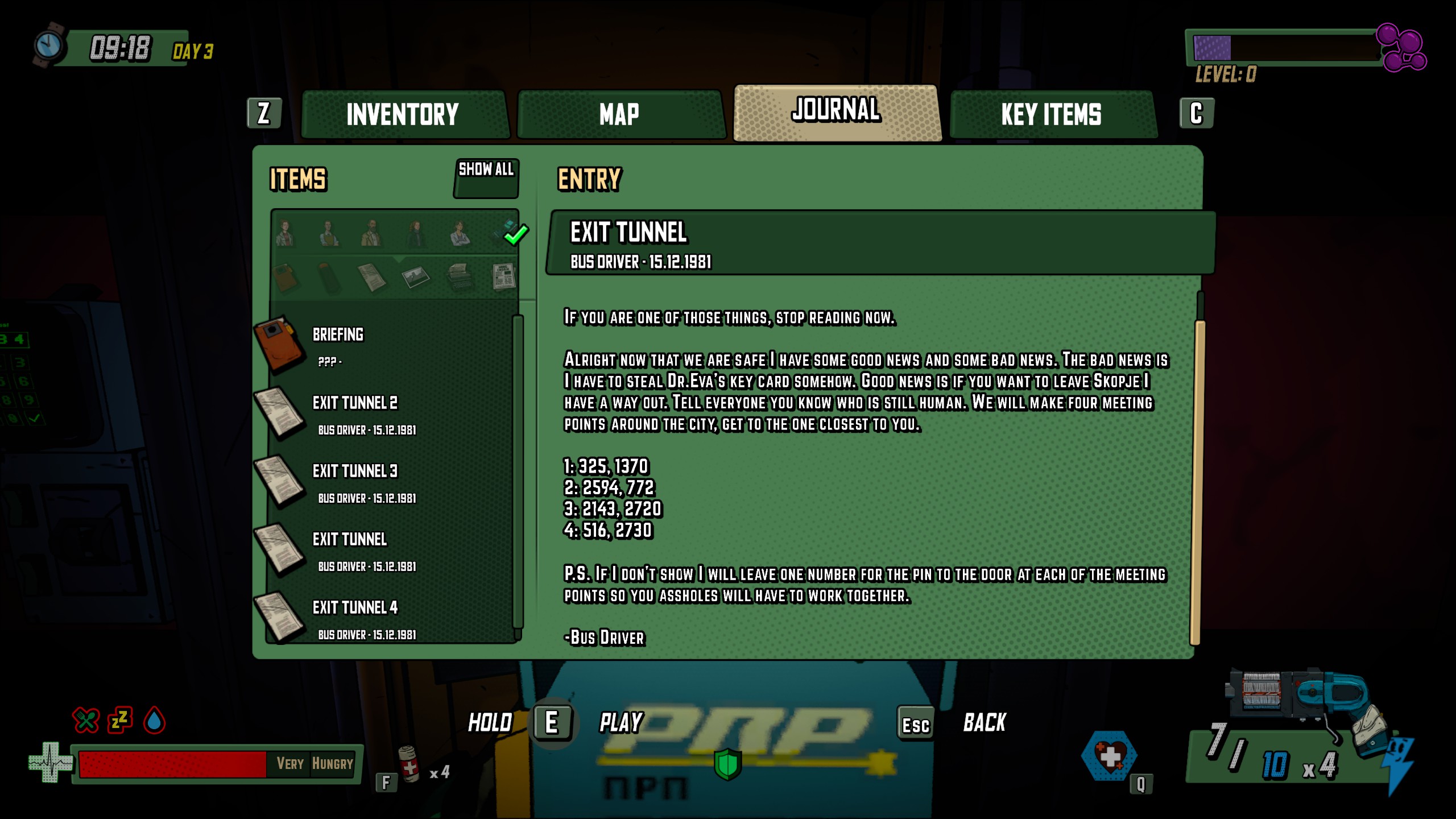 最后那道门需要密码才能开启,要获取密码你必须前往不同地点收集线索巴士司机日志它们将被分别命名为Exit Tunnel 2、3和4,每段日志将包含1组代码。