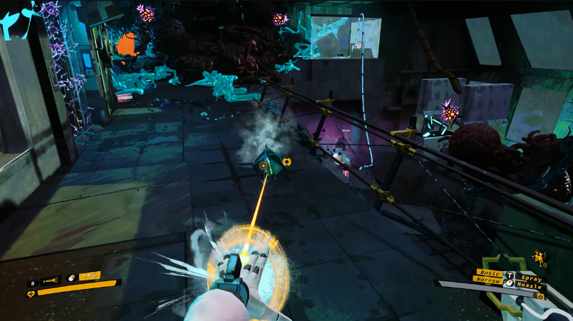 3、玩家需要利用手中的喷雾枪来消灭这些肆意生长的真菌,面对高处的真菌,利用激射可以处理更高更远的真菌。