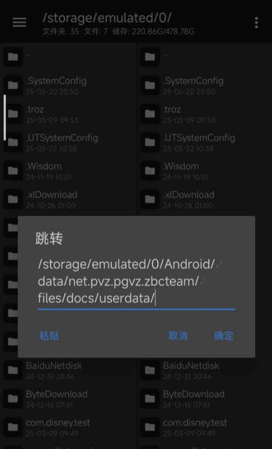 然后将/storage/emulated/0/Android/data/net.pvz.pgvz.zbcteam/files/docs/userdata/复制粘贴到地址栏,按下确定即可进入存档文件夹。