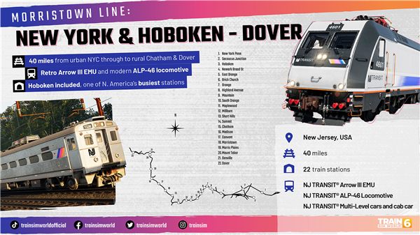 在莫里斯敦线上领略新泽西交通公司® 的电气化铁路网络。穿过莫里斯和埃塞克斯郡的郊区,乘坐经典的 Arrow III 型电力动车组、ALP-46 型机车和多层车厢列车穿梭于纽约市和通勤小镇多佛之间。