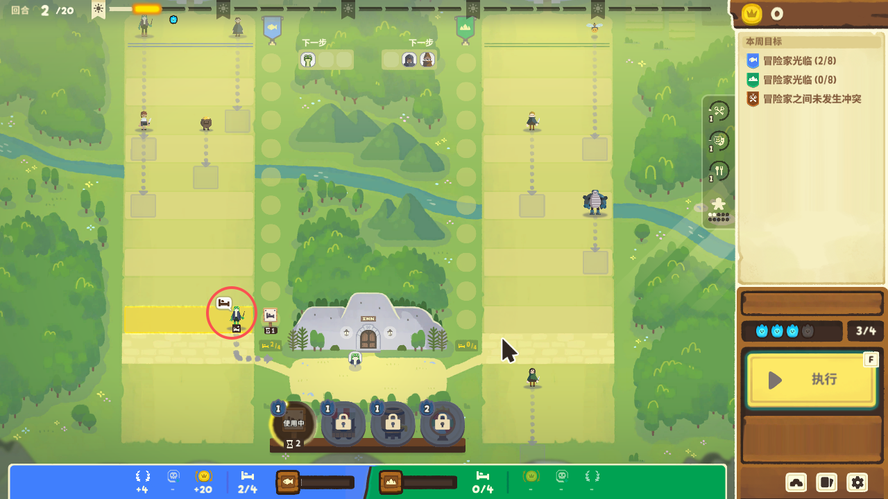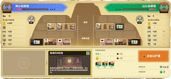 3、旅馆位于最下方,左右便是两个工会的路径,玩家可以使用广告牌,来吸引顾客进入旅馆。
