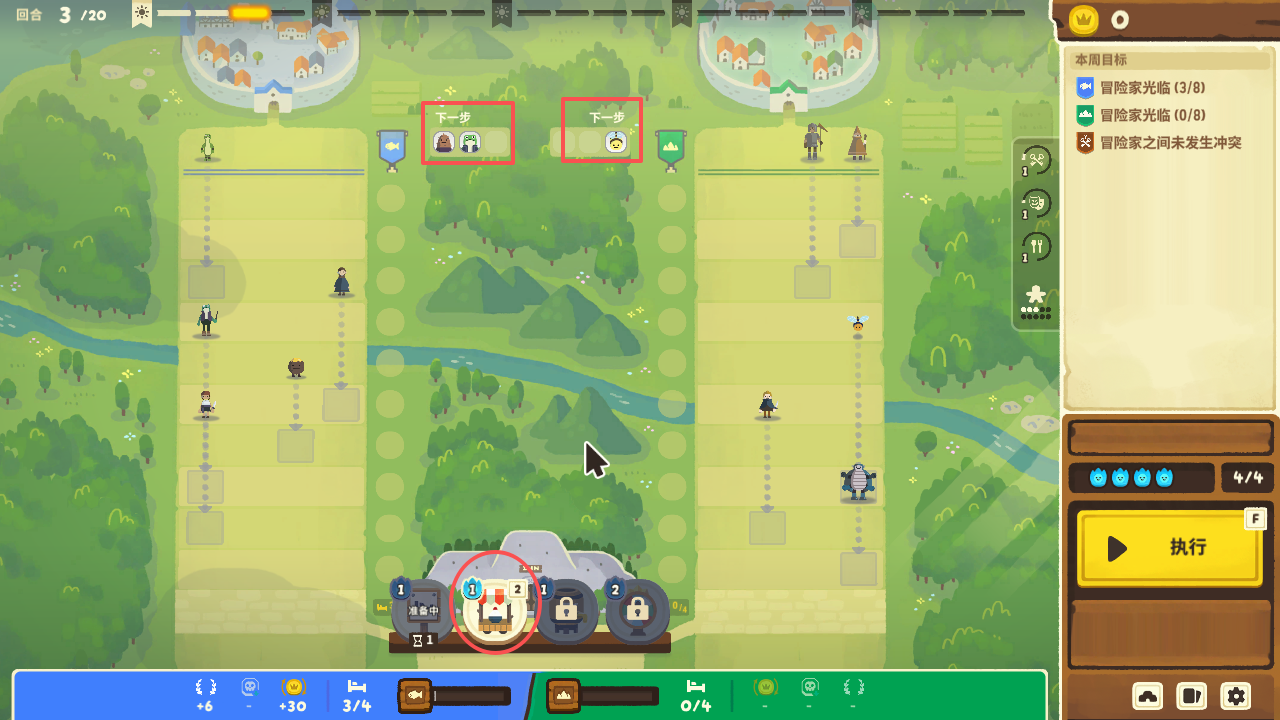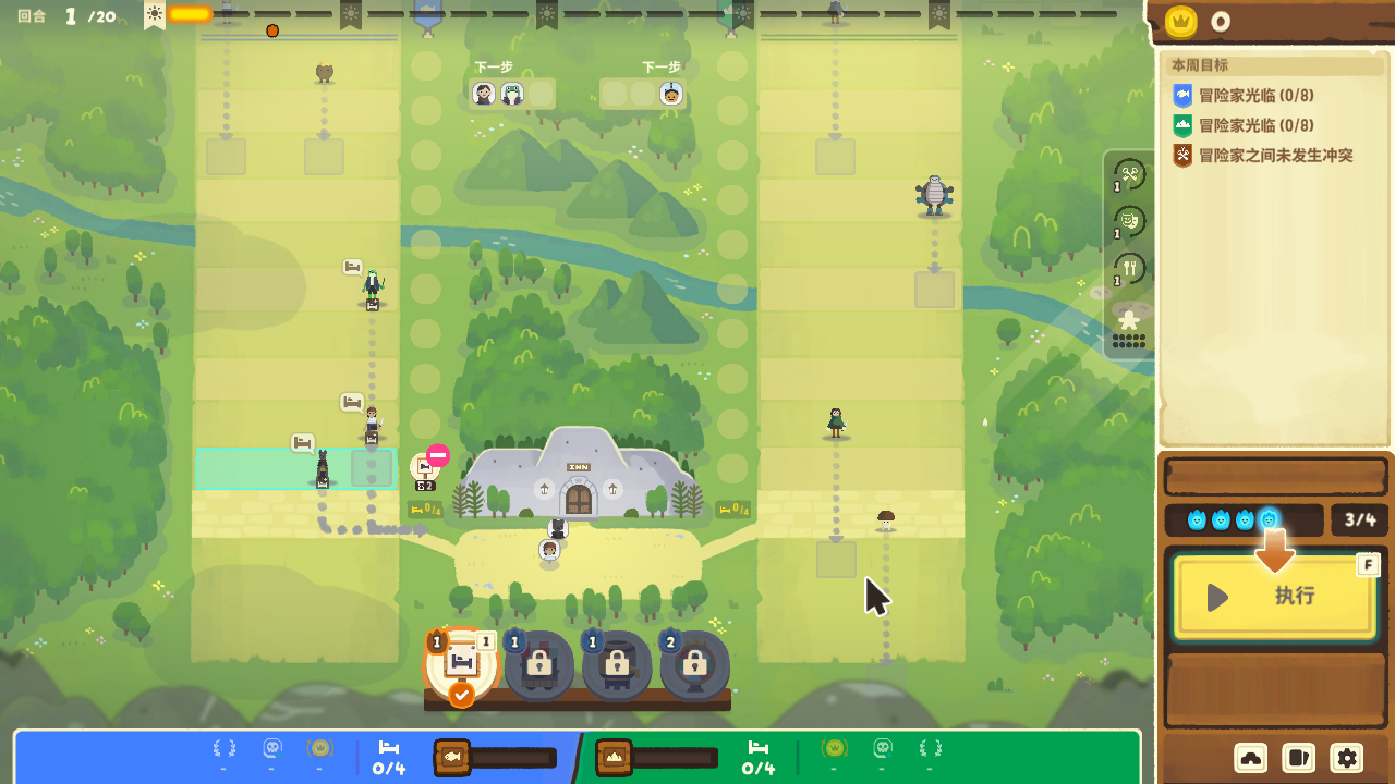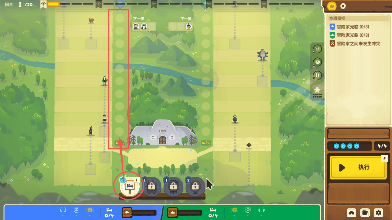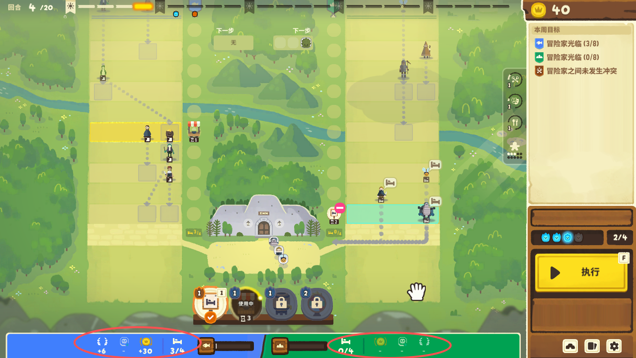游戏中最重要的是,熟练使用这些道具,游戏中可以明确看见冒险者每回合的前进步数,玩家需要利用小吃摊,能量饮料来阻止或增加他们的行动,确保不会在同一回合进入旅馆,否则就会触发战斗。