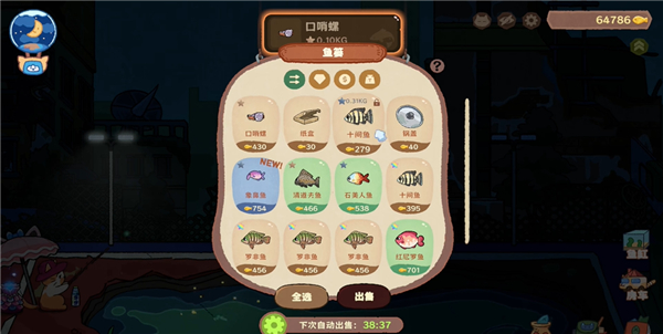 6、获得的鱼点击鱼篓即可查看,点击相应的鱼可以出售,支持一键筛选出售鱼;