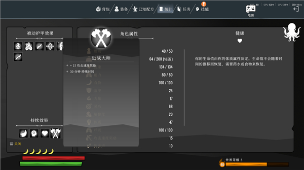 食物相较于英灵神殿有些类似,持续效果一栏最多四种状态,饱腹占一栏,床效果一栏,剩下的两栏是药水和食物。