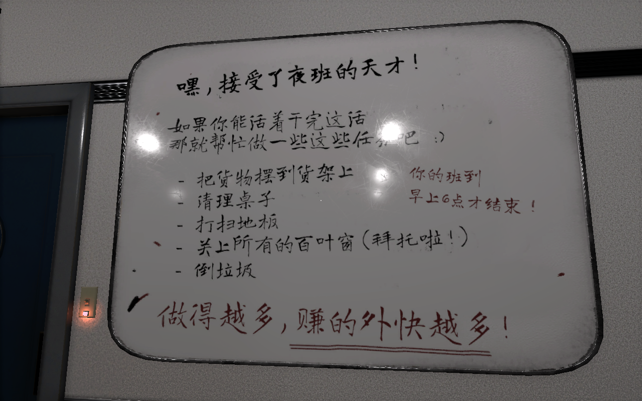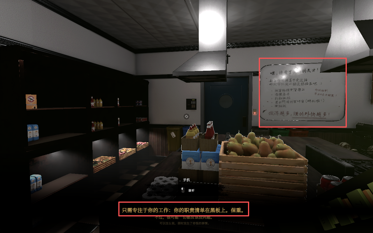 7、当玩家接通电话,玩家可以从上一班的员工口中得知白板上已经记录了自己需要做的工作内容。
