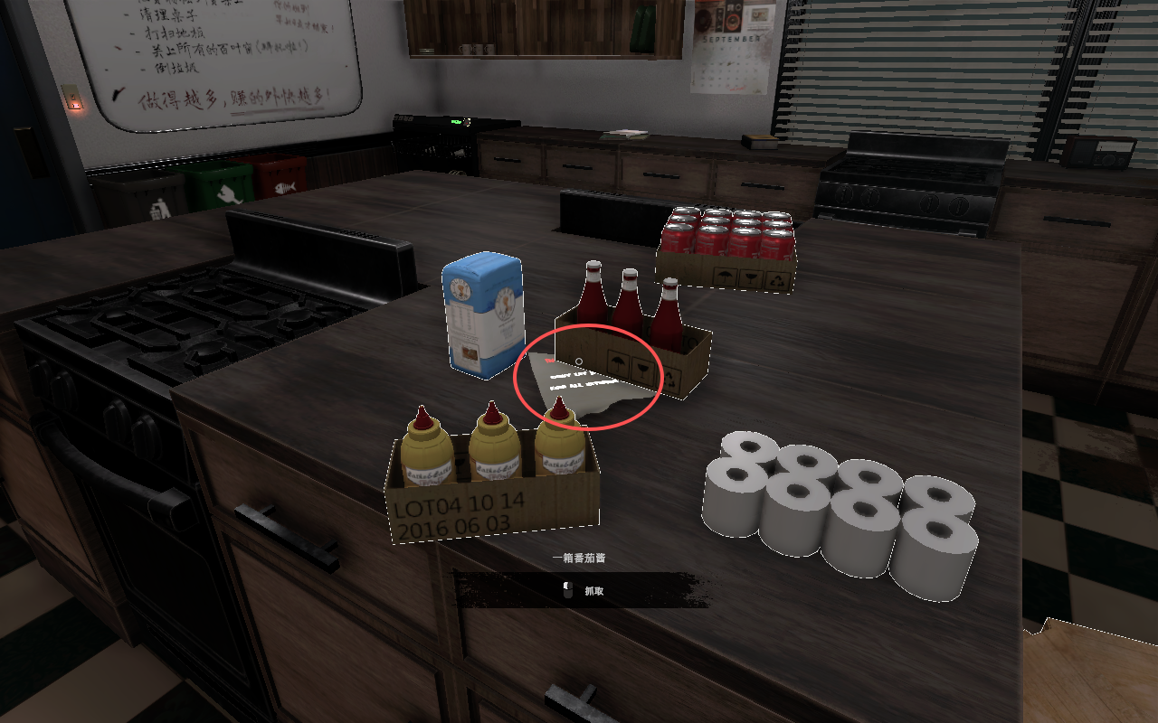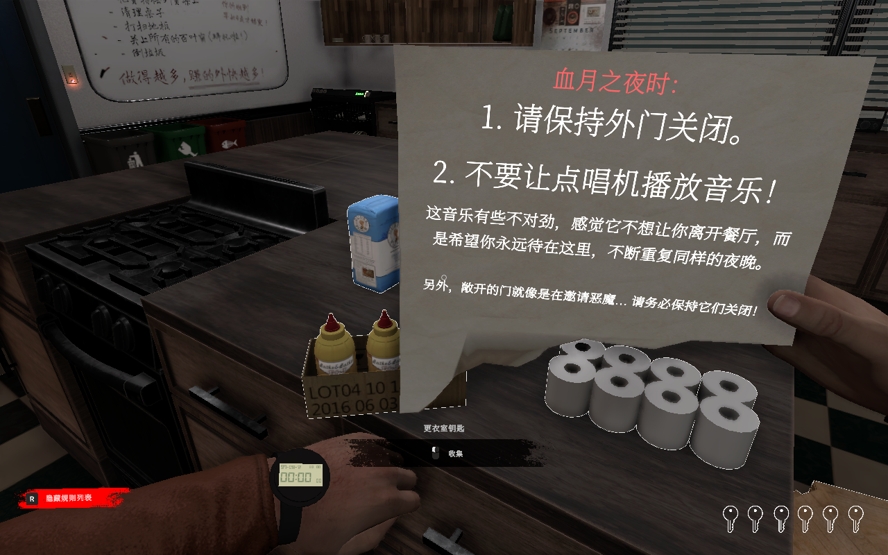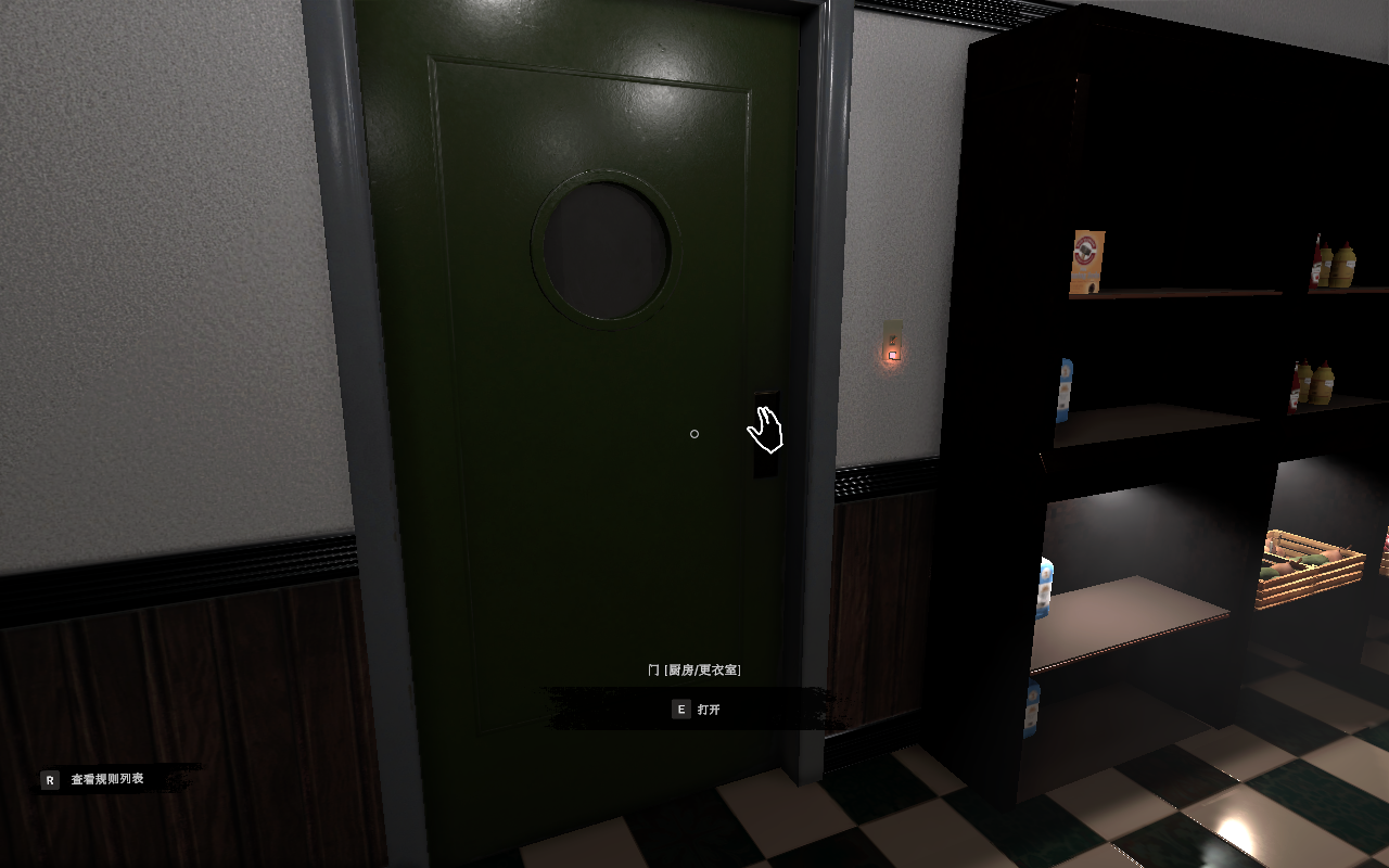 10、这就需要玩家遵守的规则,保证外门的关闭,也就是向外的大门需要关闭,拿起这张纸后就需要立即关闭我们进来的厨房后门,