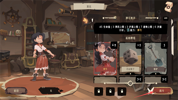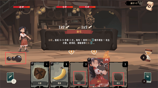 3、角色的独特卡组,弹弓,玩家可以充分利用该卡牌,可以造成高额伤害,并且当卡牌两侧拥有“碎石”时,可以额外增加一次攻击次数,玩家左侧的石头代表着攻击次数。