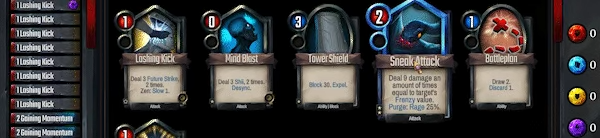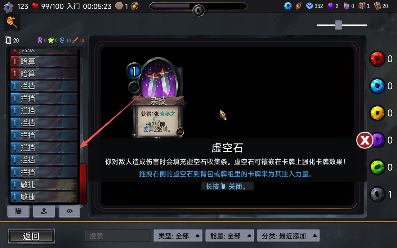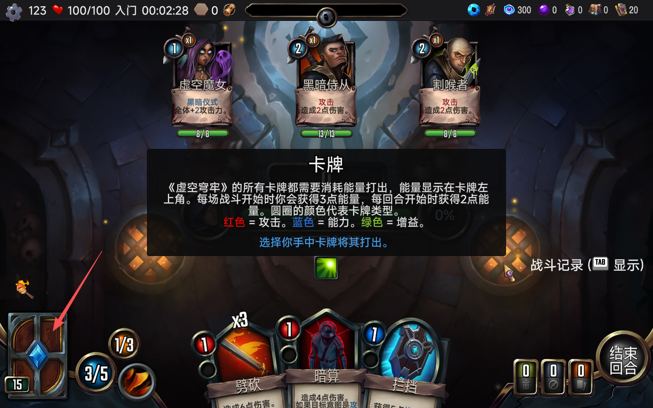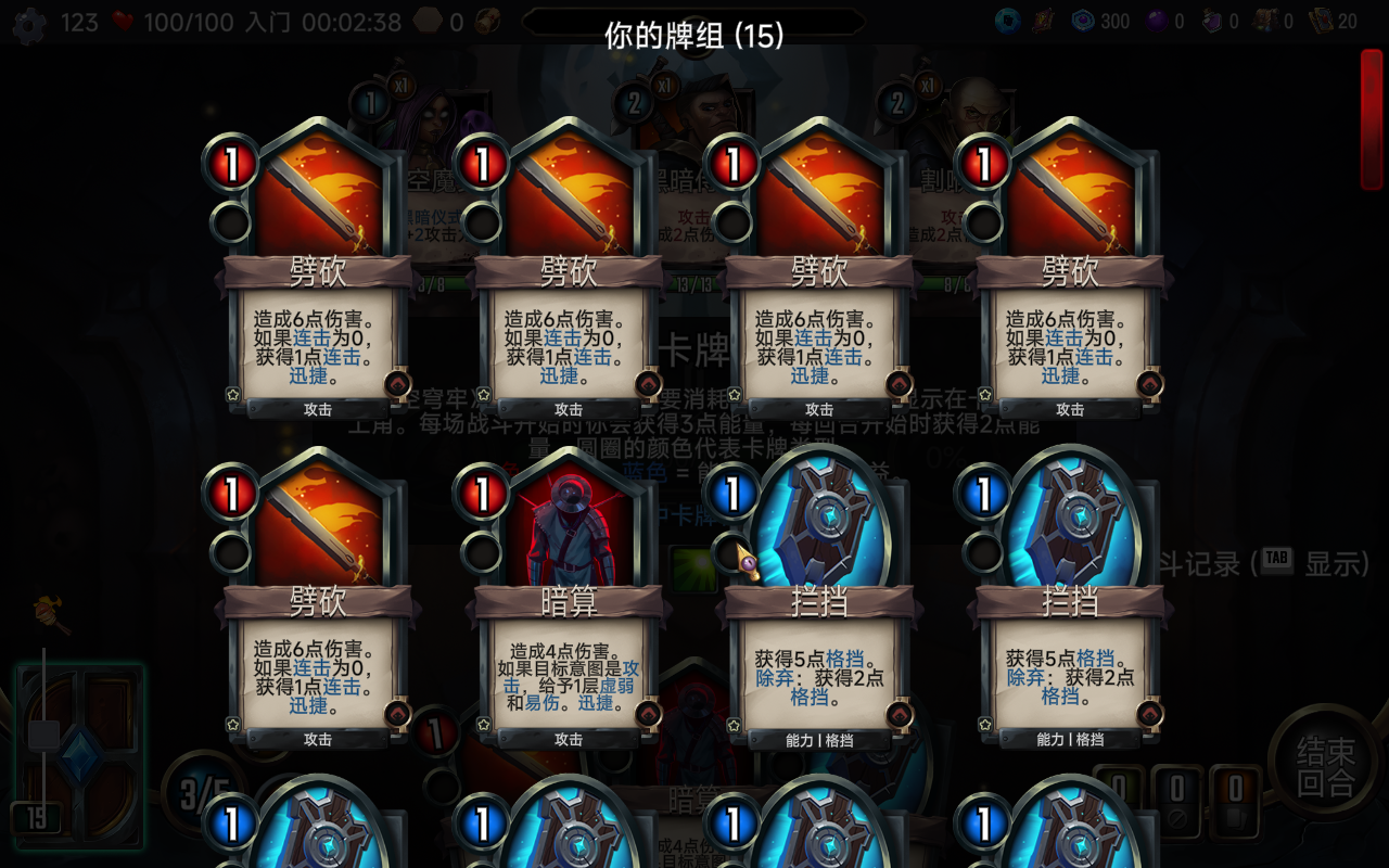 7、在其中玩家可以看见己方牌组的卡牌,红色表示攻击卡牌,蓝色则是能力,绿色为增益。