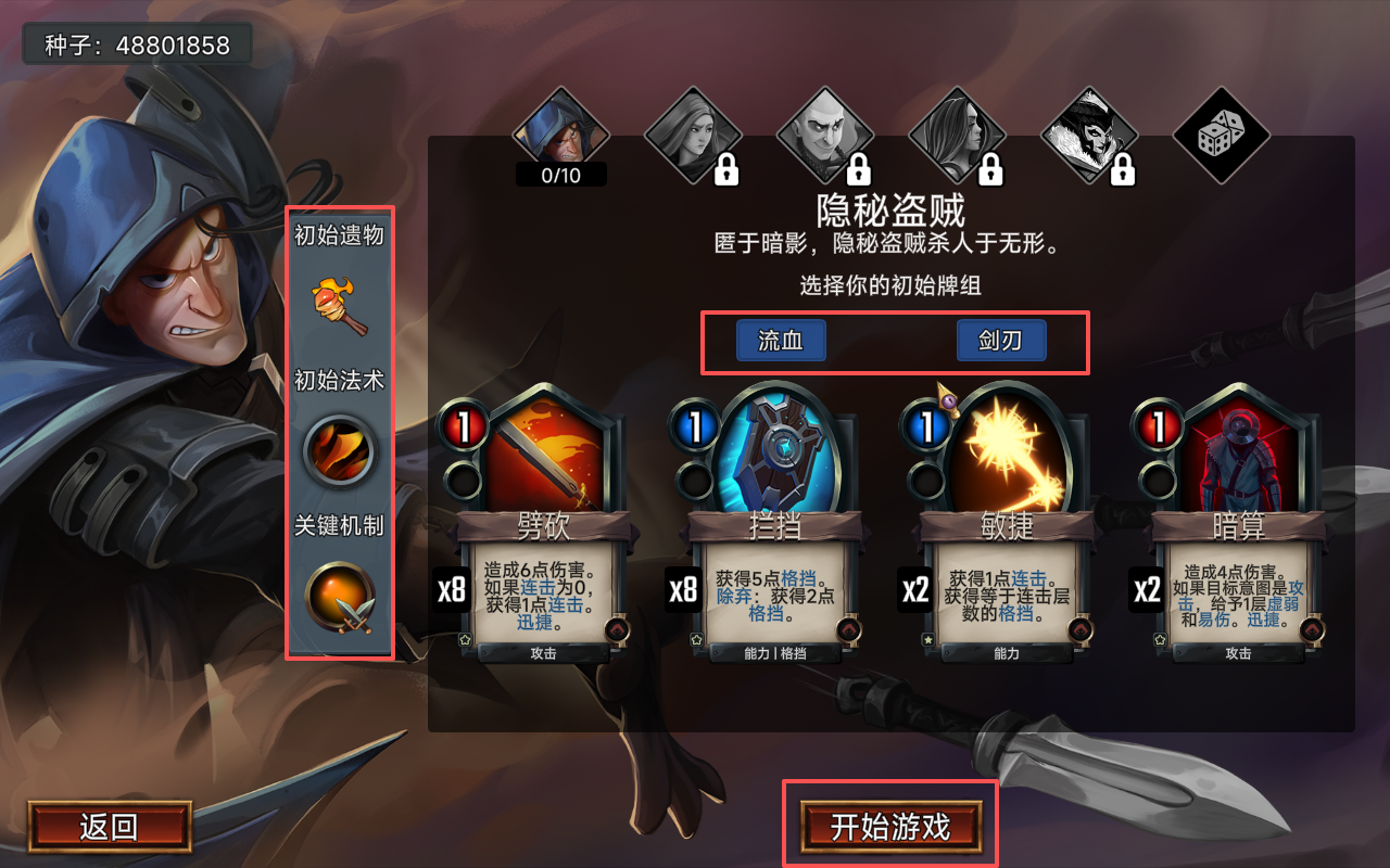2、随后就可以选择自己的角色,未解锁角色会随游戏进程而自动介绍,每个角色都有相配套的圣遗物,法术,特殊机制,以及两套相搭配的初始牌组。