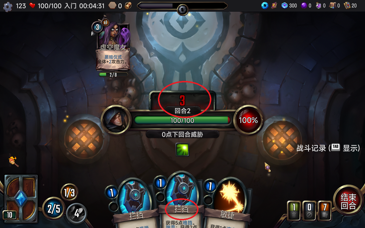 9、敌人上回合的攻击在这回合会变成威胁值,玩家需要及时使用“拦挡”,阻止敌人的伤害,如没有能量,可通过弃牌来获取相应的能量。