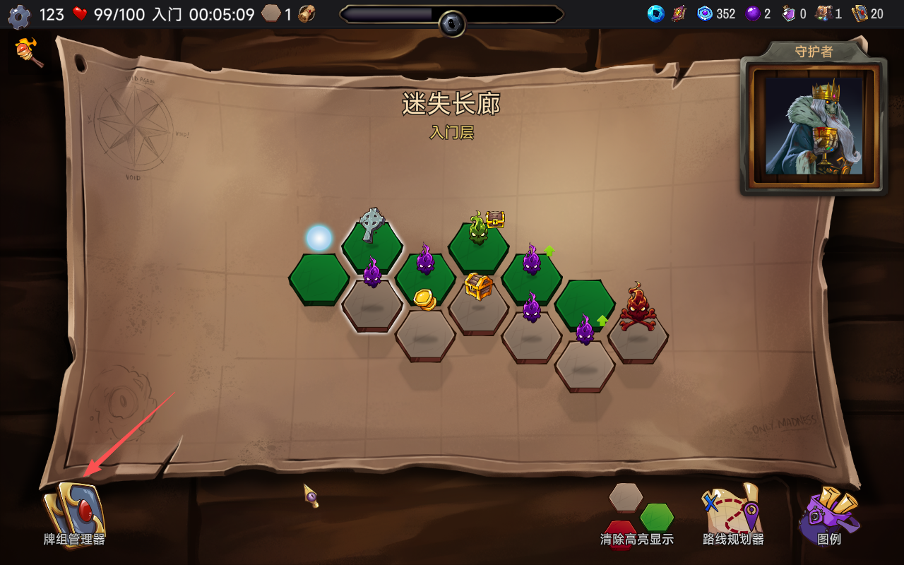 11、获得卡牌后,玩家还需要手动将其放置到自己的牌组之中,点击屏幕左下角的“牌组管理器”。