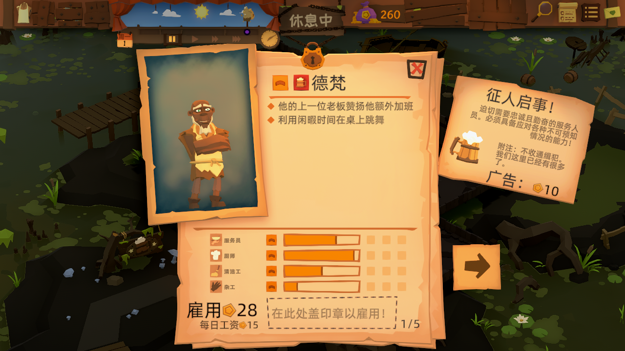 7、随后玩家就可以招募员工了,各有倾向,这位就是一位厨师,玩家可以根据价格和能力进行招募。