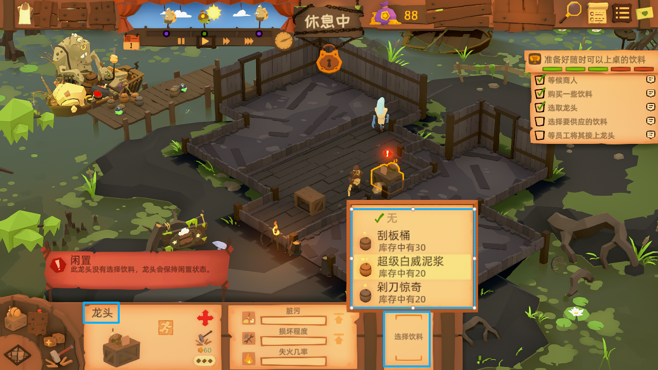 9、随后点击龙头,设置需要售卖的酒水,最后等等客人的到来即可,随着金钱的增加,玩家也就可以将自己的酒馆建设的更加繁华了。
