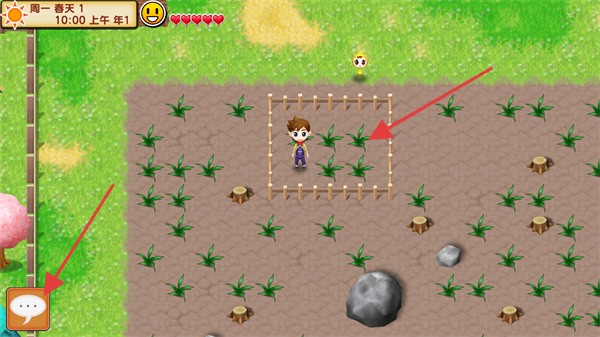 3、操控角色移动到农田区域,查看围栏内的作物种植区,准备进行开垦、种植等牧场经营操作。