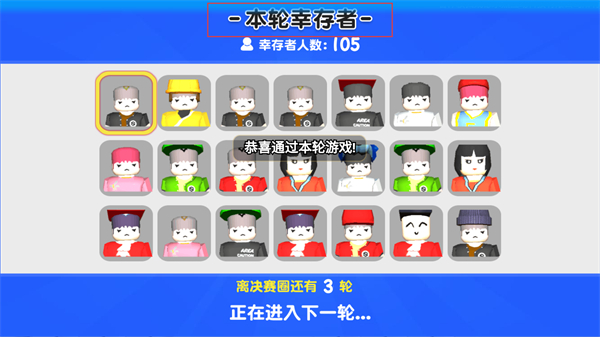 4、本轮结束后进入幸存者界面,查看【本轮幸存者-105】,等待进入下一轮,离决赛圈还有3轮。