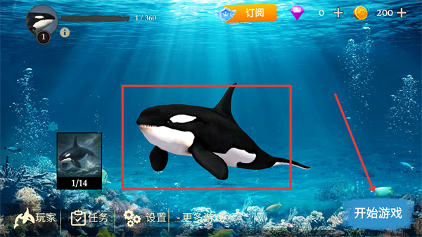 2、在游戏主界面,确认当前操控的虎鲸角色后,点击右下角【开始游戏】按钮,进入实际的游戏关卡。
