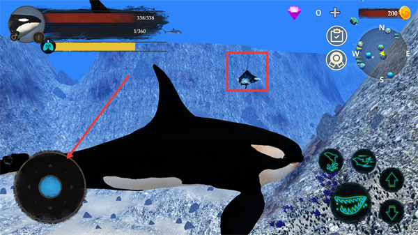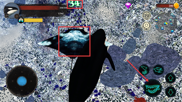 4、靠近猎物后,点击右侧的攻击按钮,控制虎鲸捕食目标,可以看到对猎物造成的伤害,完成捕食。