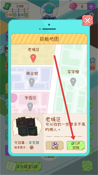 2、在房间界面点击绿色招租按钮,进入招租地图页面。