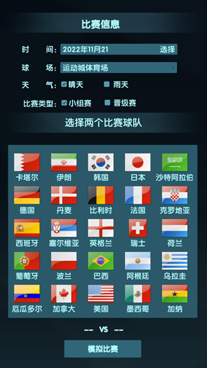 世界杯模拟器是一款非常有意思的模拟足球世界杯比赛的体育竞技游戏,由重庆诺艾铂科技有限公司研发推出,玩家将在游戏中自行选择两支队伍,还能自定义比赛的时间场地,甚至是比赛时的气温以及天气,模拟比赛开始后,虽然玩家无法直观的看见比赛画面,却可以以文字的形式了解比赛过程,无论是射门,越位,犯规等,都会详细的记录下来,让玩家实时掌控比赛的进程,喜欢的玩家千万不要错过哦。
