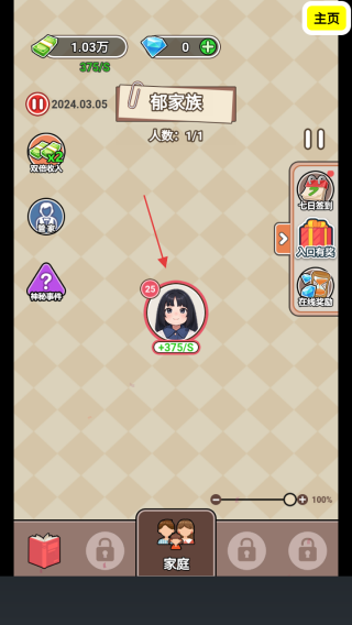 2、进入家庭界面,关注成员信息,通过互动提升家族收益与发展。