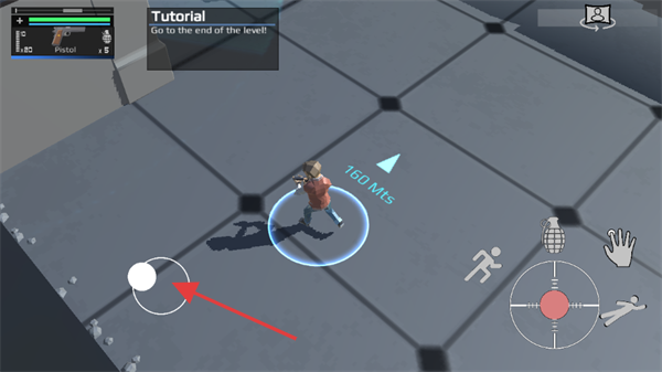 1、点击移动摇杆,控制角色在场景中移动,按指引前往关卡终点。