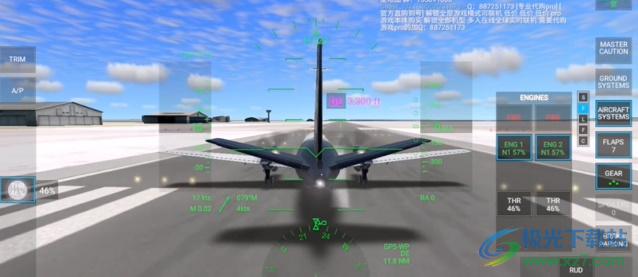 4、最后打开飞机系统中的ENGINES发动机面板,慢慢推动油门到45%左右,松开手刹让飞机滑行持续把油门推到95%,注意不要偏离轨道,系统默认陀螺仪操作;