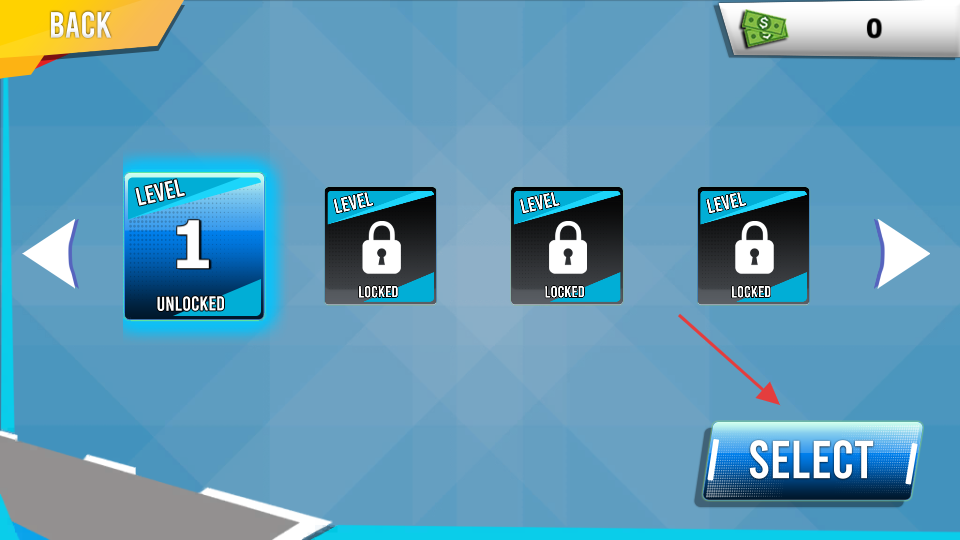 2、在关卡选择界面,点击【SELECT】按钮,选择已解锁的关卡1开始游戏。