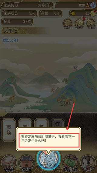 1、点击【下一年】按钮推进时间,让家族发展随时间推进,查看下一年可能发生的事件与变化以规划后续行动。