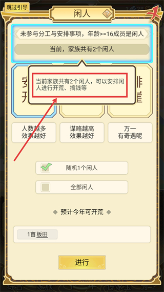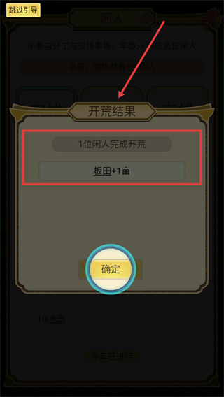 4、一位闲人完成开荒获得【板田+1亩】,确认结果后继续安排其他闲人进行生产活动积累资源。