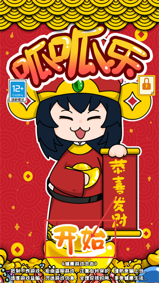 1、进入【呱呱乐】游戏,点击【开始】按钮进入玩法,游戏标注【12+-CADPA适龄提示】,需注意适龄范围。