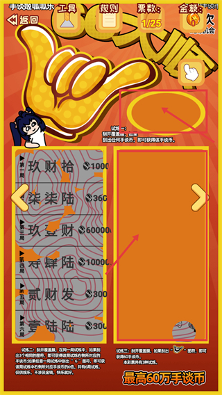 2、玩法包含多局试炼,【试炼一】规则为刮开覆盖膜,刮出硬币即可获得对应手谈币,需按规则操作。