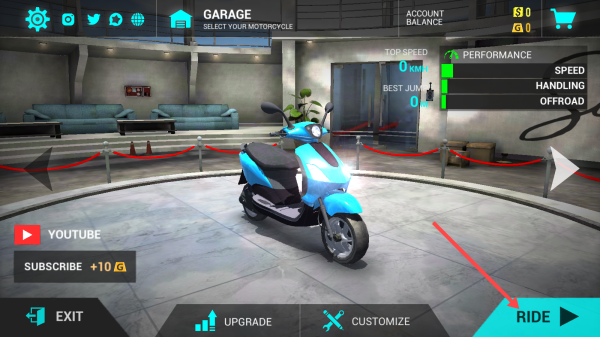 1、在车库界面,点击右下角的【RIDE】按钮,进入游戏模式选择界面。