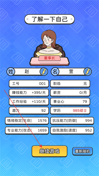 1、查看自身属性面板后,点击继续游戏进入主界面。