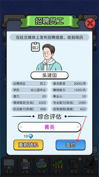 2、在招聘员工界面,选择综合评估为菁英的吴建国,点击签约录用。