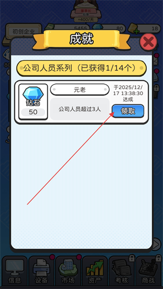 3、当公司人员超3人时,触发元老成就,点击去领奖进入成就界面。