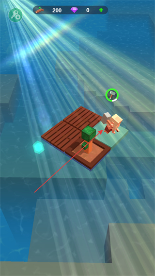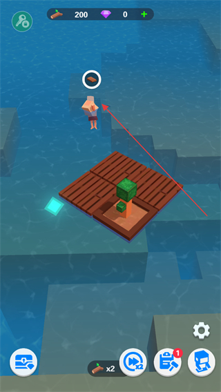 1、角色在木筏上自动收集资源,积累材料以解锁更多建筑,推进建造进度。