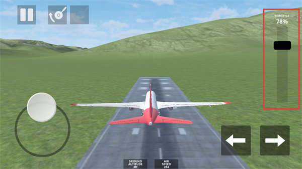 3、驾驶时调整右侧进度条控制动力,配合左侧操控按钮调整飞机方向,在跑道上滑行。