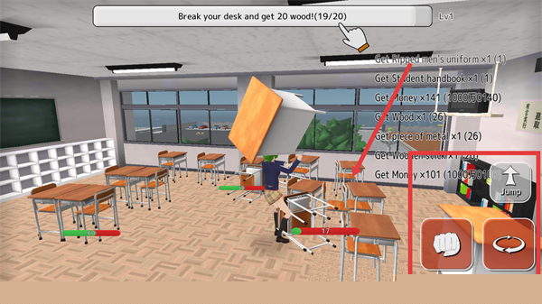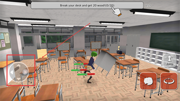 2、进入教室场景,按照提示,用移动摇杆控制角色,点击攻击键破坏桌子。