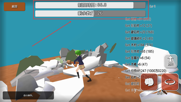 3、持续右侧【攻击】【技能】【跳跃】破坏桌子等物品,收集【木材】【金属片】等素材,积累资源以便后续制作更强武器提升破坏能力。